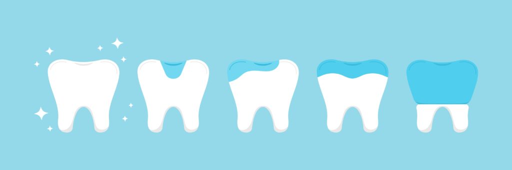 歯の根元に茶色や黒い塊がついている場合は、歯石が沈着している可能性があります。歯石は歯垢(プラーク)が石灰化したもので、表面がざらざらしているため細菌がさらに付着しやすくなります。歯石は自分では除去できず、歯科医院でのスケーリング(歯石除去)が必要です。歯石がついている部位は、周囲の歯ぐきが炎症を起こしている可能性が高いです。