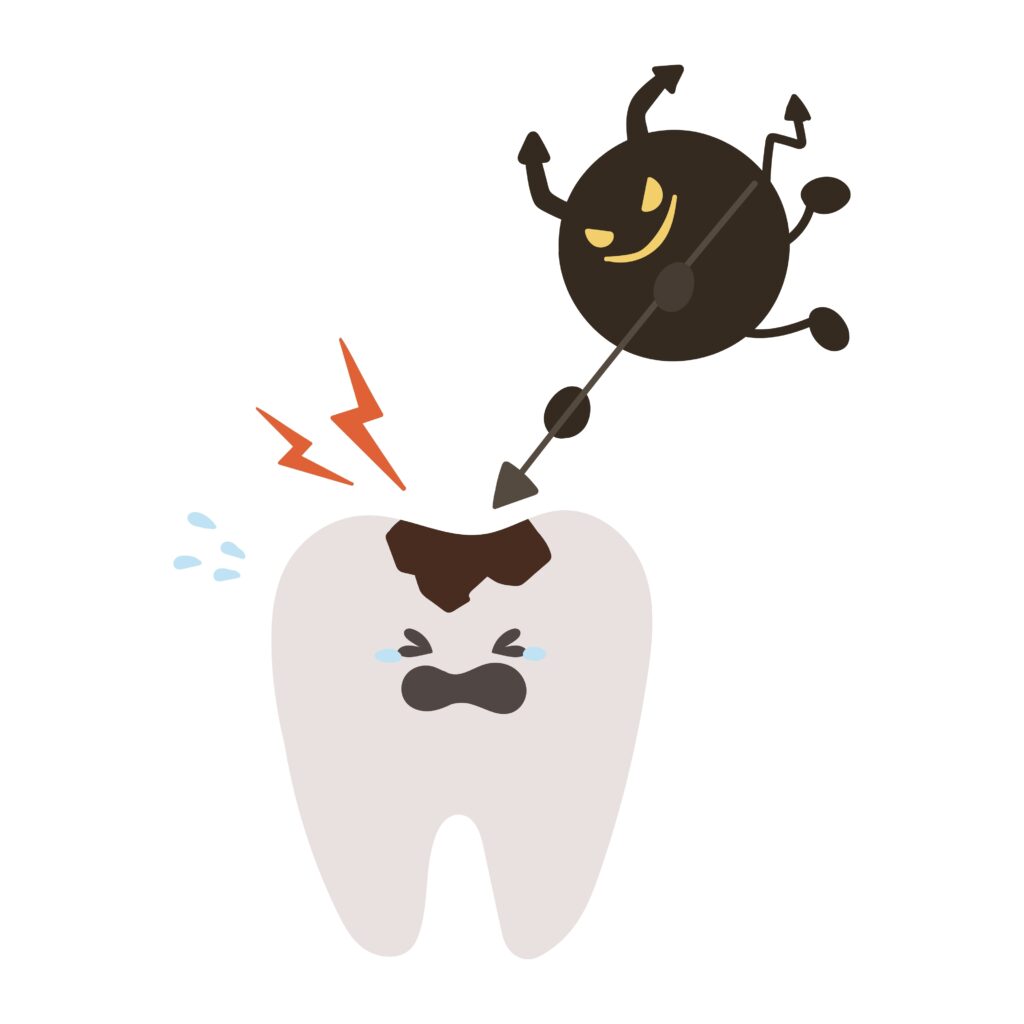 しかし口呼吸によって唾液が不足すると、これらの保護作用が低下し、虫歯菌が産生する酸が歯に長時間触れ続ける状態になります。その結果、歯が溶けやすくなり虫歯のリスクが大幅に上昇します。